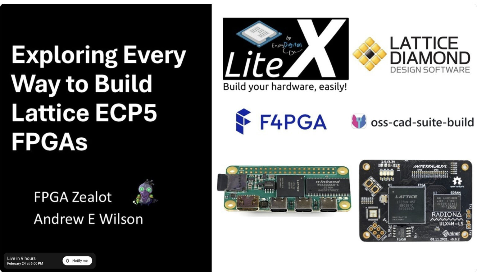 This online talk and workshop explores multiple approaches to designing and working with Lattice ECP5 FPGA devices, with a strong focus on open-source toolchains, workflows, and hardware platforms. The latest version of the ULX4M board is used as a reference hardware platform for practical demonstrations and real-world examples throughout the session.